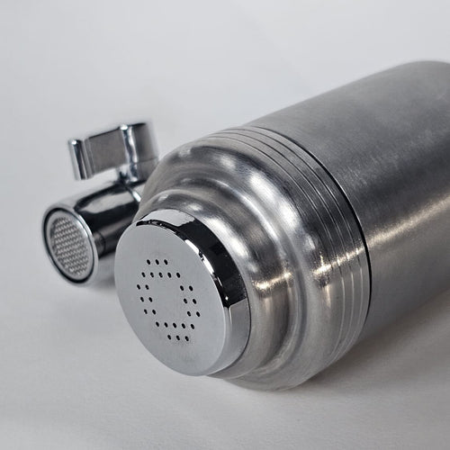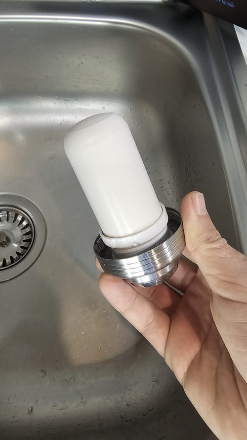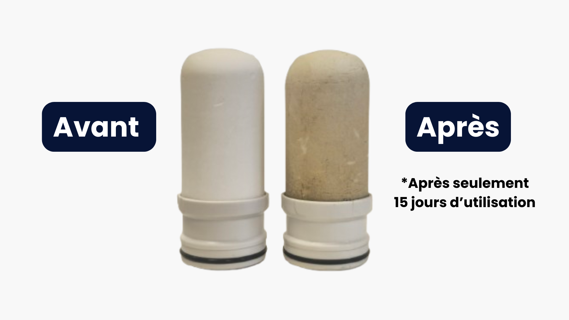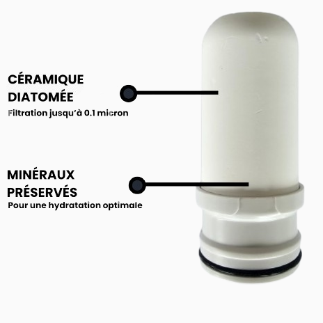 Les cartouches filtrantes naturelles intègrent un dôme en céramique diatomée et sont enrichies d'un cœur en charbon actif provenant de fibres de coco, permettant une filtration précise à 0,1 micron et préserve les minéraux.