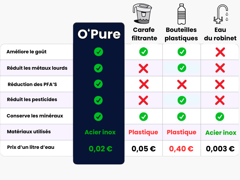 O'Pure est une solution fiable conçue pour protéger votre santé des polluants tout en améliorant le goût de l'eau de votre robinet.